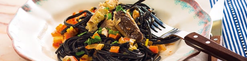 Enjoy the sardine, one of the most popular and famous Portuguese fish. Here it is ready to eat, without skin or bones and in the company of a delicious black linguine.