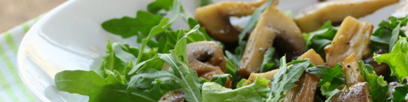 - Add the mustard and set aside. To assemble the salad, cover the plate with green leaves, place the mushroom mixture on top and decorate with chopped strawberries.