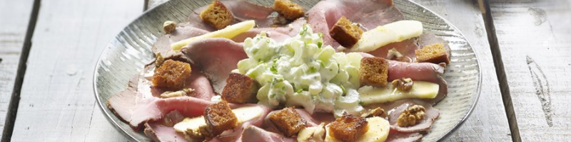 - Corte a maçã em quartos e retire o miolo. Divida os pedaços de maçã em fatias iguais e disponha-as em cima do carpaccio de rosbife.