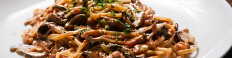 - Numa frigideira aquecida colocar o azeite e os alhos picados, depois laminar os cogumelos e adicioná-los ao refogado, logo seguidos do linguine e dos coentros frescos cortados. Deixe refogar.