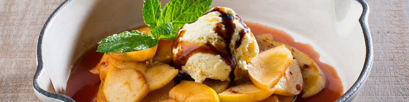 Maçã laminada morna com molho agridoce e gelado de baunilha. Uma delicia de sobremesa.