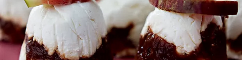 - Forre 20 forminhas de petit gâteau de 3 cm de altura com plástico próprio para alimentos e faça camadas de queijo, creme de figos e queijo novamente.