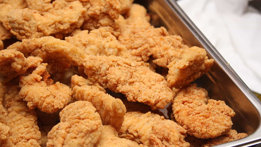 - Frite o frango, algumas tiras de cada vez, por 2-3 minutos de cada lado ou até dourar.