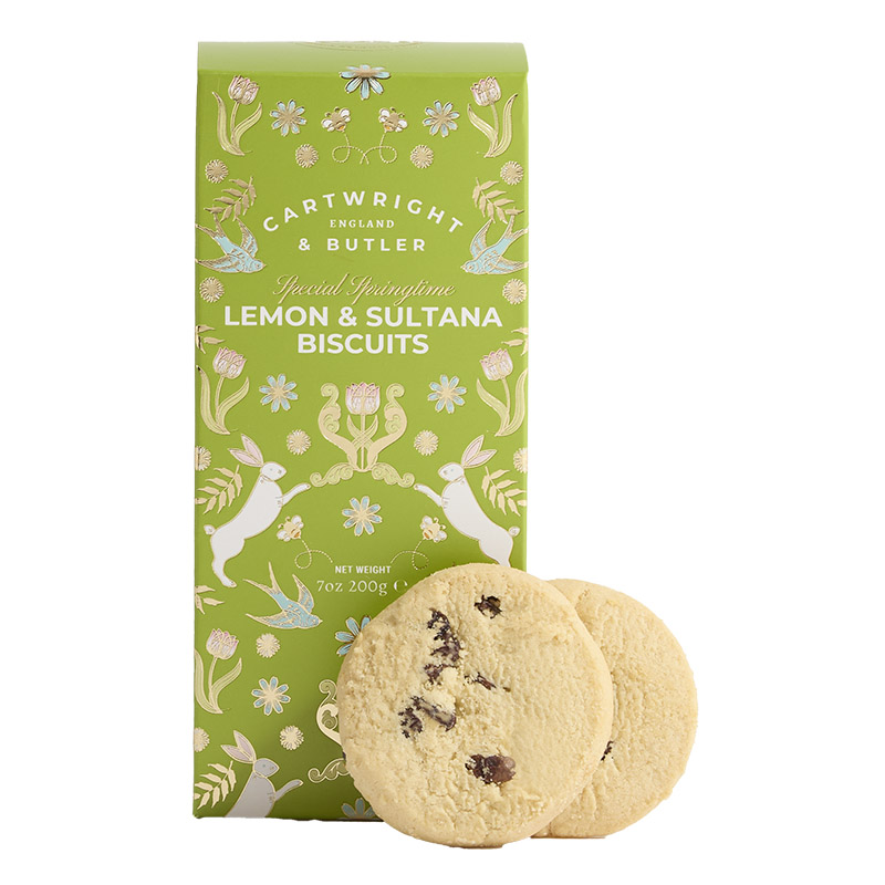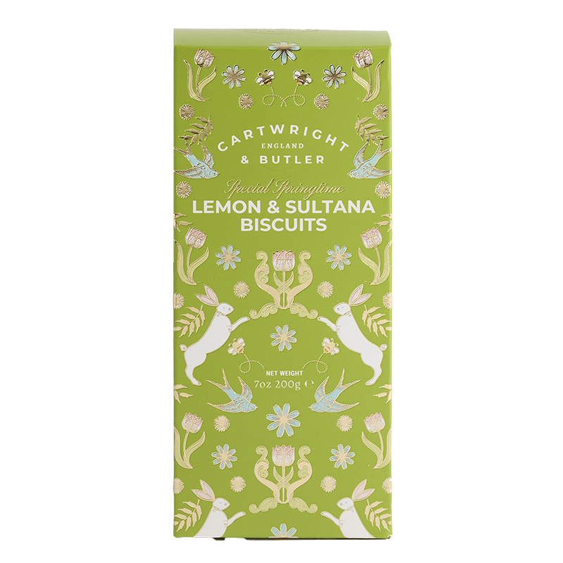 The perfect treat, these sweet, crumbly and utterly buttery sultana biscuits are delightfully complemented by a light crisp and zesty taste of lemon. The perfect taste of spring ideal for dunking in hot fragrant tea or with your favourite seasonal tipple. These biscuits are beautifully encased in a easter carton decorated with rabbits, spring flowers and swallows. Share with your favourite people or keep all to yourself to make the moment last even longer.
