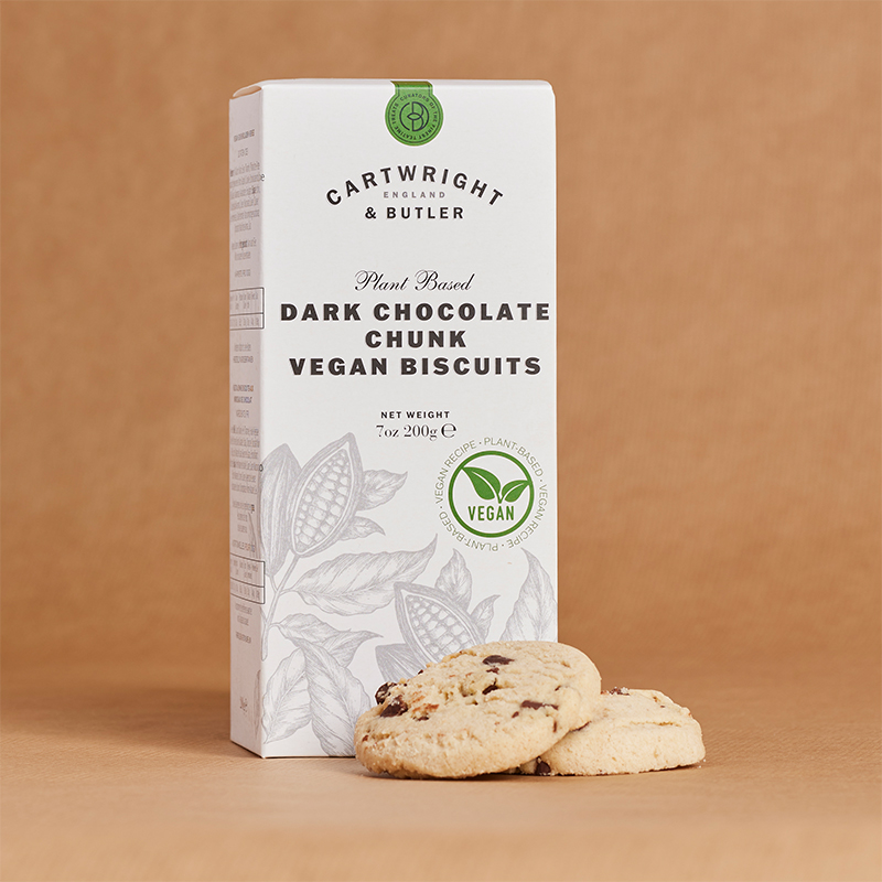 A crunchy, crumbly biscuit with generous dark chocolate chips. Cartwright and butler’s inspiration for this recipe came from a classic combination pattern, of dark chocolate biscuits, now without butter.
