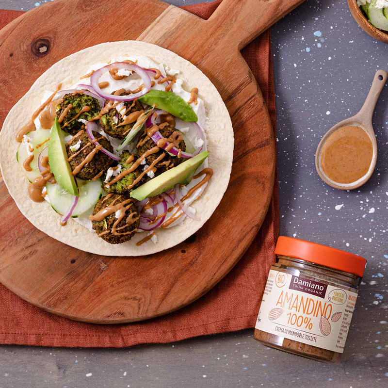 Amandino Roasted Almond Cream is prepared only with organically grown almonds, selected and roasted in the Torrenova factory, preserving the precious oils of the nuts. Roasted almond paste is excellent on bread, but also an unexpected ally in the kitchen: try adding it to classic cakes, such as Italian ciambella, or as a topping on savory dishes, such as a tasty piadina.