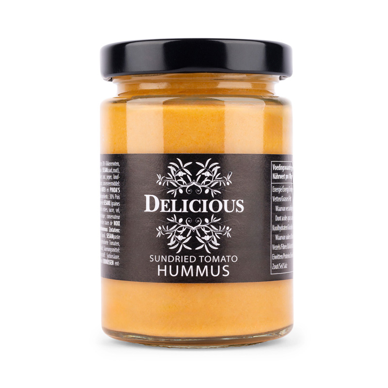 Hummus, or chickpea paste 100% natural with sun dried tomatoes. Without any additives it is ideal as a spread or as a snack with vegetables or grissini. You can also add it to other dishes such as pasta and salads.