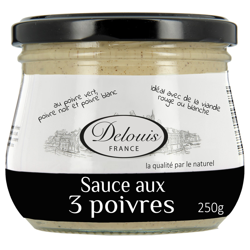 Sauce with green pepper, black pepper and white pepper. Delicious with a piece of meat, vegetable fries, steamed vegetables and even shellfish, it will quickly become an essential in your cupboard.