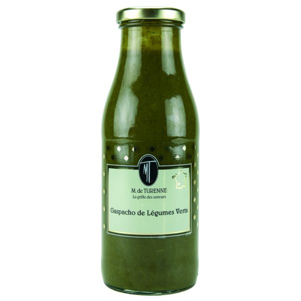 M. de Turenne Green Vegetable Gazpacho contains Tomato, pepper, onion, cucumber, extra virgin olive oil , salt, wine, vinegar, garlic and spices. Composed of 100% natural ingredients, this product promises to bring a touch of freshness to your summer afternoons and evenings.