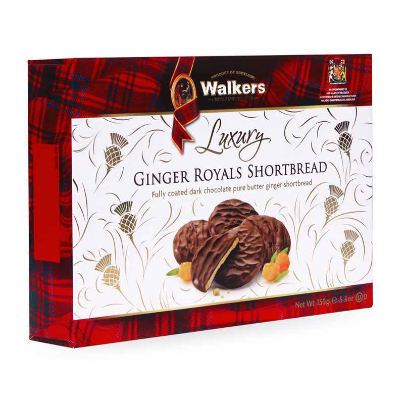 Smothered in rich, smooth chocolate, these deliciously luxurious stem ginger biscuits are fit for Royalty. Walkers Luxury Ginger Royals are a unique shortbread, combining the moistness of real stem ginger with the crispness of Walker’s traditional pure butter shortbread and the irresistible taste of dark chocolate, resulting in a savoury symphony of delight that you simply must experience to appreciate. Like all Walker’s biscuits, these are best enjoyed in company. Make memories with the special people in your life – give a box of Ginger Royals and savor them together.