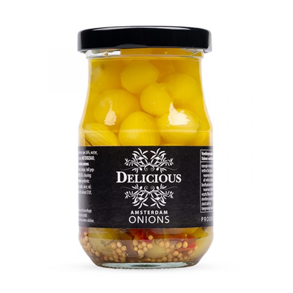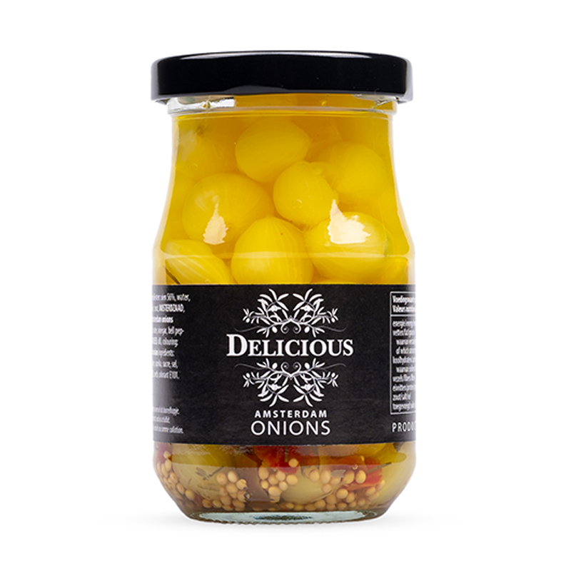 Deliciosas cebolas holandesas autênticas com um sabor fresco e doce e uma textura crocante. Delicioso com bebidas, principalmente com cubo de queijo e linguiça.