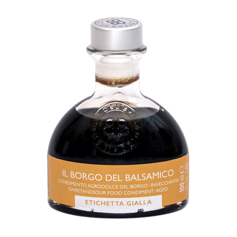 O Condimento Balsâmico Borgo Amarelo da Il Borgo del Balsâmico tem um sabor generosamente fragrante e ligeiramente picante.