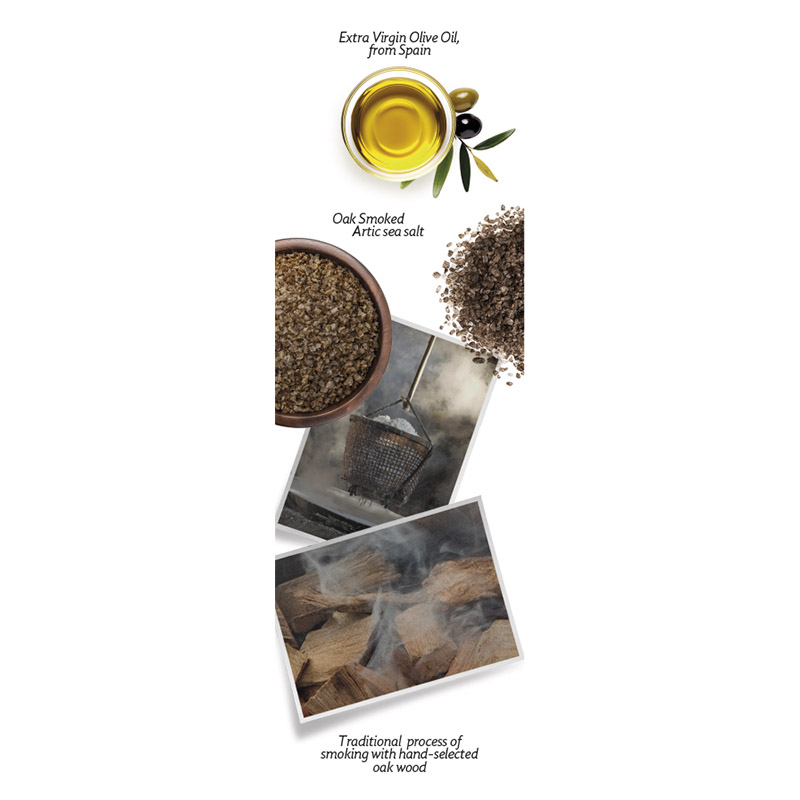 Deliciosas crackers feitas com sal marinho fumado naturalmente sobre madeira de carvalho e azeite virgem extra. Uma cracker que combina com qualquer queijo.