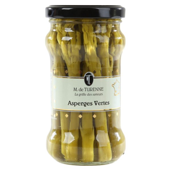 Os espargos verdes franceses mais perfeitos, recém colhidos, cozidos ao vapor e cuidadosamente colocados em frasco.