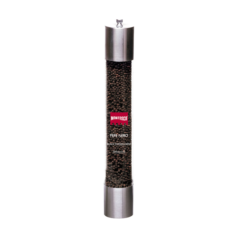 Este Moinho grande da Montosco contém pimenta preta de Tellicherry, com uma fragrância pungente e um sabor intenso e condimentado, é considerada por muitos uma das melhores pimentas do mundo. A pimenta é seca lentamente a baixa temperatura para preservar o seu sabor e aroma. Este Moinho de Pimenta Preta possui um mecanismo cerâmico recarregável, mede 38cm de altura e a moagem é facilmente regulada rodando o botão no topo.