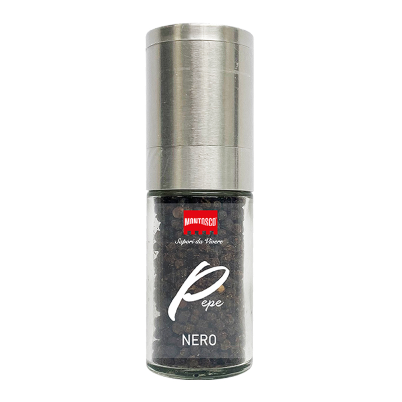 Este Moinho grande da Montosco contém pimenta preta de Tellicherry, com uma fragrância pungente e um sabor intenso e condimentado, é considerada por muitos uma das melhores pimentas do mundo. A pimenta é seca lentamente a baixa temperatura para preservar o seu sabor e aroma. Este Moinho de Pimenta Preta possui um mecanismo cerâmico recarregável e a moagem é facilmente regulada rodando o botão no topo. Pelo seu design, funcionalidade e apresentação é ideal para ir à mesa.