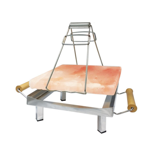 Um suporte de metal feito para suportar na perfeição um prato de sal Rosa dos Himalaias. Excelente para auxiliar quando pretende confeccionar algo com este mesmo prato ou simplesmente como suporte para o armazenar quando não está em utilização.