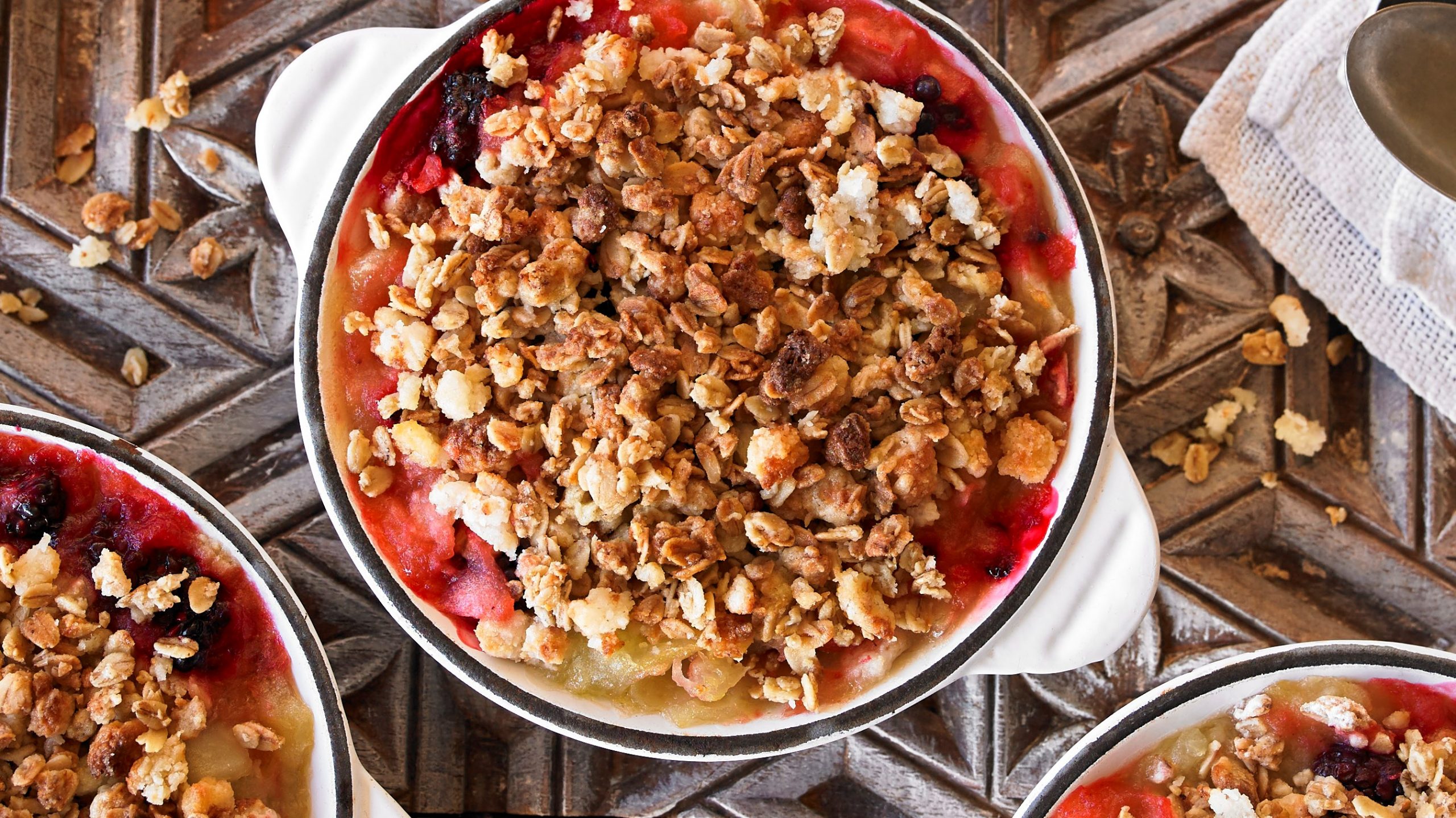 - Coloque tudo no forno por 30-40 minutos, até que a fruta amoleça e a cobertura fique dourada e crocante.